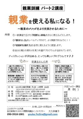 日常生活で親業のメソッドを気軽に活用できるように、親業訓練一般講座の復習をしながら、聞く技術・伝える技術を磨きます。